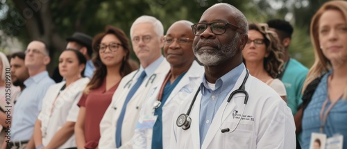 A proud group of healthcare professionals stands in a line, projecting a sense of resilience and unity in an outdoor environment.