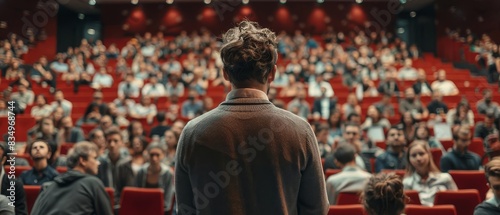 A psychologist delivering a lecture on mental health to a large audience selective focus, education theme, whimsical, fusion, lecture hall backdrop