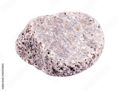 A pumice stone with a rough, porous surface and a gray-brown color, a classic example of lightweight volcanic rock, isolated on a white background.