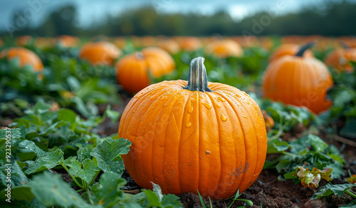 A pumpkin is sitting in a field of pumpkins. The field is full of pumpkins of different sizes and shapes
