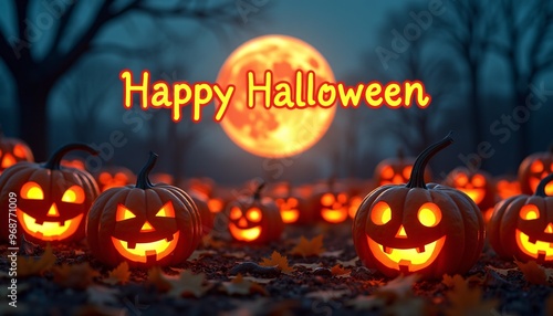 A Pumpkin Patch Under a Full Moon with Glowing Jack-O'-Lanterns and the Message 'Happy Halloween' in Vibrant Orange