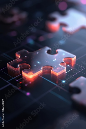 A puzzle piece is shown in a black background with a red glow. The puzzle piece is surrounded by a grid of squares, and the image has a futuristic feel to it