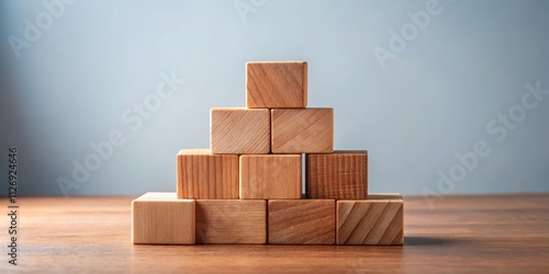 A pyramid of nine wooden blocks, arranged in a triangular formation, sits on a wooden surface against a pale blue backdrop.