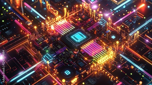 A quantum computer isometric rendering, with a central CPU surrounded by luminous data connections and vibrant light trails.