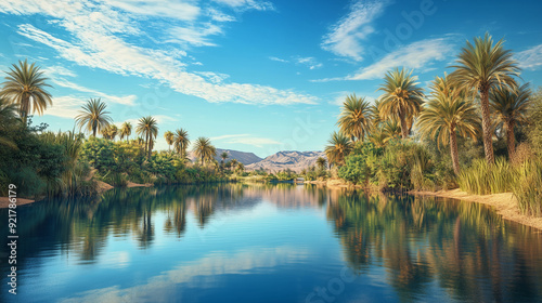 A quiet and peaceful oasis in a desert landscape, where the calm water reflects the clear blue sky and green palm trees line the shores.