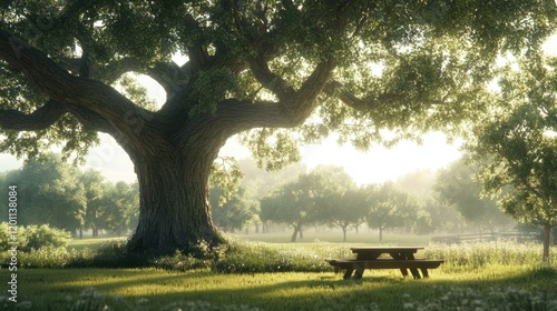 A quiet parkland with a picnic table under a large oak tree on a sunny day
