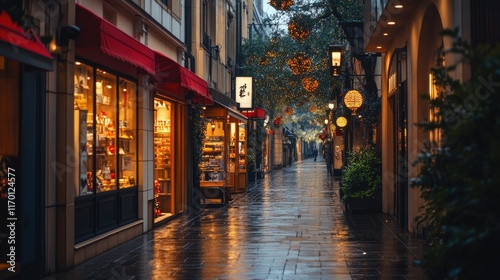 A quiet side street in Ginza with boutique storefronts and modern design elements.