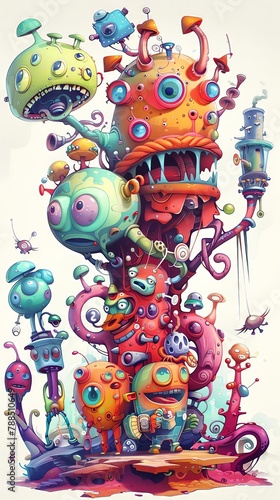 A quirky and colorful art piece showing a family of characters in a fantastical world