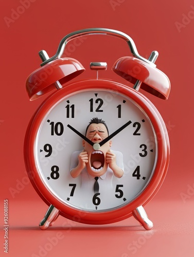 A quirky red alarm clock featuring a miniature person expressing alarm, perfect for themes of time, urgency, and morning routine.