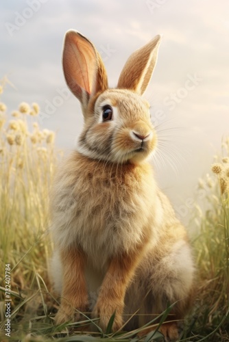 A rabbit sitting in a field of tall grass. Perfect for nature and wildlife enthusiasts