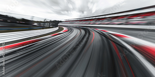 A race track with motion blur on the left side, white background, and stripes in sharp focus.