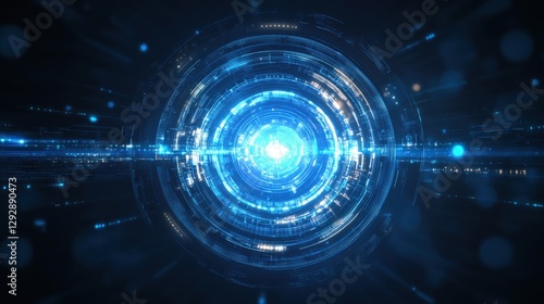 A Radiant Blue Energy Sphere Surrounded by Circular Digital Patterns and Glowing Particles in an Abstract Technology Background with a Sci-Fi Feel