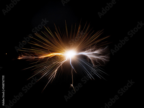 A radiant burst of light and energy, resembling a cosmic explosion or electrical discharge, explodes against a dark background. The vibrant hues suggest intense power and captivating beauty.