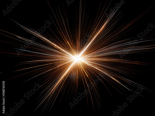 A radiant burst of light, emanating from a central point, explodes outwards in a dazzling display of golden and white streaks against a pitch-black background. The effect is one of intense energy and