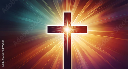 A radiant digital illustration of a Christian cross with a sunburst behind it, symbolizing resurrection and hope, with bright colors and space for text.