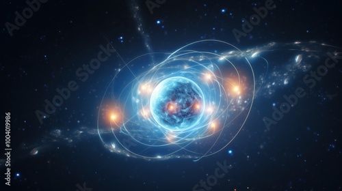 A radiant, glowing artistic depiction of an atom, surrounded by swirling particles set against a cosmic backdrop.