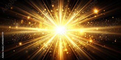 A radiant golden explosion of light with a burst of shimmering particles and rays radiating outward against a dark background