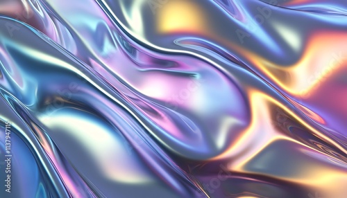 A radiant holographic foil with rainbow gradients transitioning over sleek metallic waves