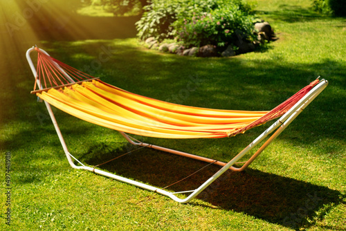 A rag hammock on the green grass.Relax in nature. Hammock on metal struts in the garden. Summer vacation at home.