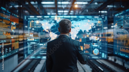 a rail logistics expert planning route optimizations for high-speed trains on a digital map, in a modern office.