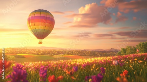 A rainbow-colored hot air balloon gently floats above a serene countryside, surrounded by blooming fields. The soft sunset casts a dreamy glow over this enchanting landscape, inviting adventure.