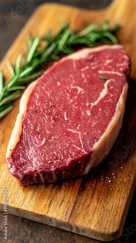 A raw New York strip steak sits on a butcher block cutting board, accompanied by sprigs of fresh rosemary.