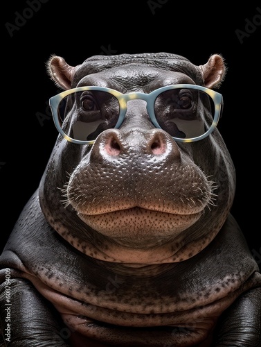 A real hippo cool with black sunglasses. Generative AI