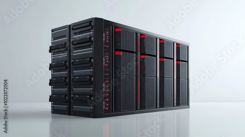 A realistic 3D illustration of a server computer set in a futuristic digital environment, surrounded by streams of electronic data and glowing circuits.