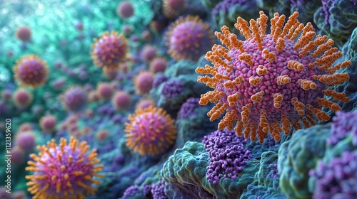 A realistic 3D rendering of a virus surrounded by cells in a blue, green, and purple color scheme