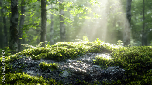 A realistic 4K 3D background image shows sunlight filte through the trees in a lush green forest, with a side angle view of moss-covered rocks below.