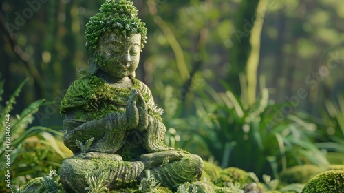 A realistic and serene image of a moss-covered Buddha statue, captured in a photorealistic and detailed style