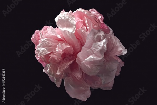 A realistic animation of a pink peony blossom slowly unfurling its petals on a rich black canvas.