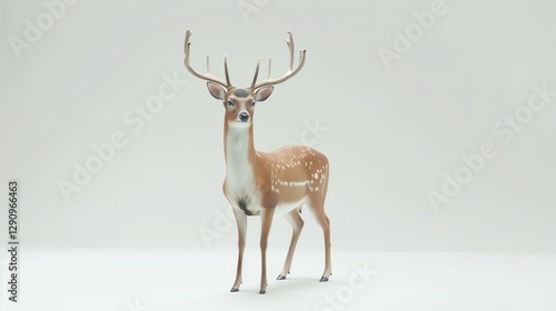 A realistic deer standing gracefully, isolated on a clean white background, with its detailed fur and antlers illuminated by soft, even lighting.