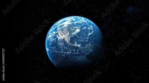 A realistic depiction of Earth suspended in space, centered and floating against a void, accentuating the planet's iconic blue hue and spherical form. The Earth dominates the frame.