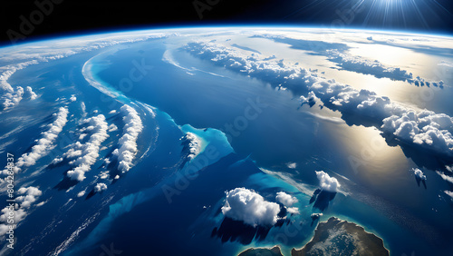 A realistic illustration of Earth as seen from space, with continents clearly visible in the deep blue ocean, in a style reminiscent of high-resolution satellite imagery