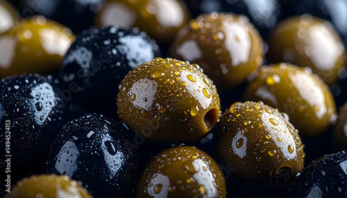 A realistic macro photograph showcasing a colorful mix of various olives immersed in golden olive oil.