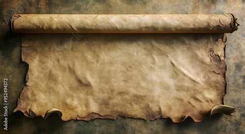 A realistic old blank antique paper scroll with visible frayed edges with enough copy space for text. The scroll has no text, set against an old background of stone or wood, of history best feeling.