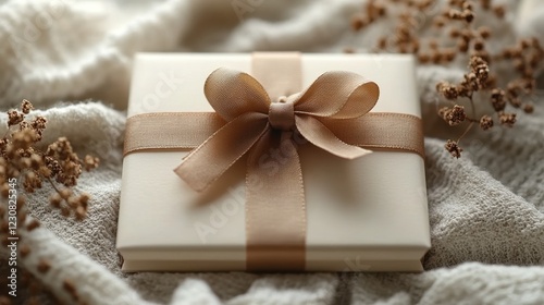 A realistic personalized gift box mockup with a satin ribbon, subtle details of the paper texture, soft background lighting