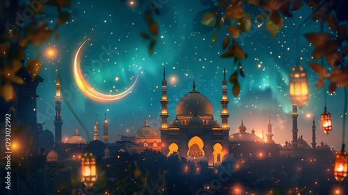 A realistic Ramadan backdrop featuring a mosque, crescent moon, stars, lantern, and bokeh effects