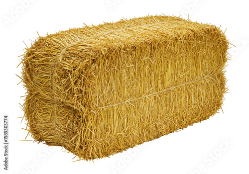 A rectangular bale of dry straw, tied with twine, isolated on a transparent background