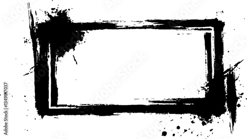A rectangular frame is drawn with brush strokes on white background. Grunge frame for your design. Black ink brush painted frame with copy space, creativity grunge design element.