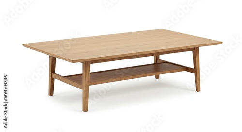A rectangular wooden coffee table with a light-colored top and a darker lower shelf set against a plain white background