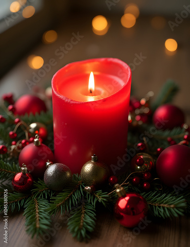 A red candle is decorated with Christmas ornaments and decorations during the holiday season.