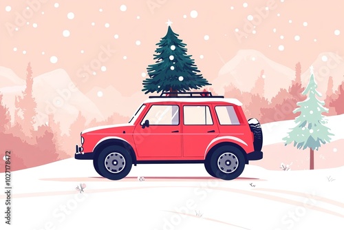 A red car with a Christmas tree on the roof, a flat design illustration, simple and cute. Vector art with a winter background