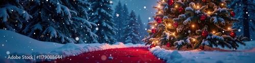 A red carpet flowing like a river through a winter wonderland scene, ending at a majestic Christmas tree with a sparkling star on top, sparkle, holiday cheer