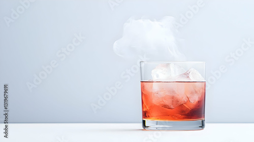 A Red Cocktail In Rocks Glass With Ice Cubes and Smoke on White Table Against Minimalist Bright Background