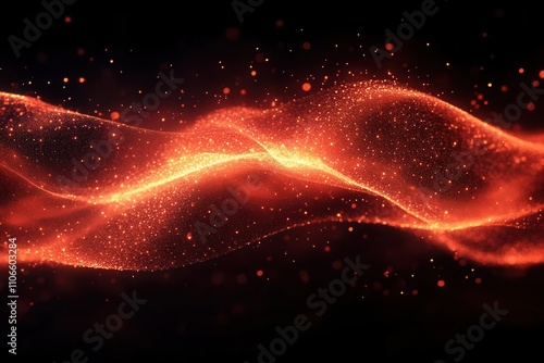 a red glowing abstract wave shape, radiating from the center against a grainy black background, creating a striking contrast and a minimalistic aesthetic that suggests movement and energy