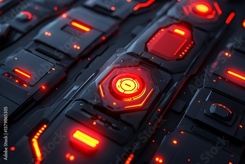 a red glowing light on a black sci-fi panel with buttons and panels, a futuristic background for a design element.