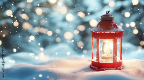 A red lantern's warm glow illuminates the pristine winter snow