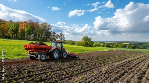 A red tractor tills the soil of a large field on a sunny day with a blue sky and green trees in the background.